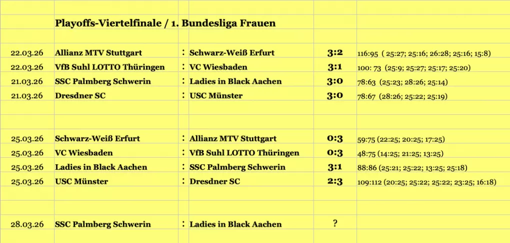 Mit Stuttgart, Dresden und demVfB Suhl LOTTO Thüringen haben sich drei der favorisierten Mannschaften durchgesetzt. Lediglich der SSC Palmberg Schwerin muss gegen die Ladies in Black Aachen in ein entscheidendes drittes Spiel.